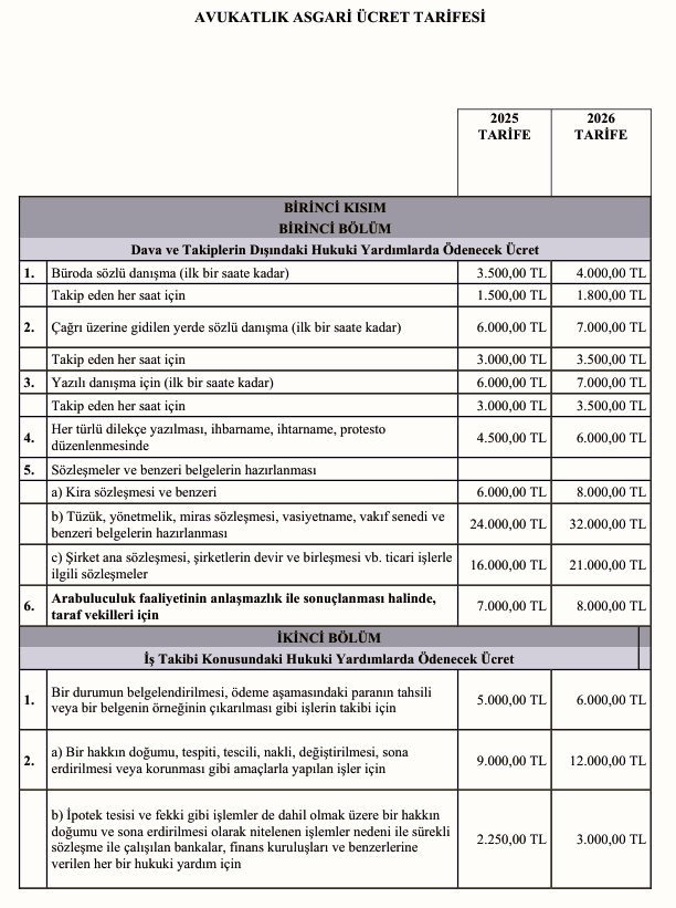 Türkiye Barolar Birliği (TBB) tarafından hazırlanan 2025-2026 yılı Avukatlık Asgari Ücret Tarifesi Resmi Gazete‘de yayımlanarak yürürlüğe girmiştir. Yeni düzenleme ile birlikte avukatlık hizmetlerinde önemli ücret artışları gerçekleştirilmiştir.