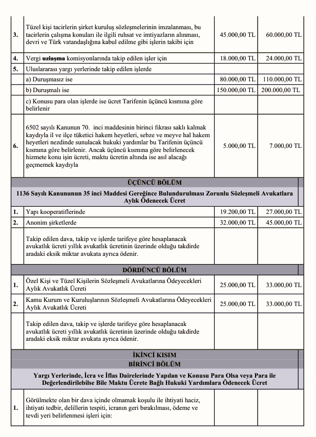 - Anonim şirketlerde bulundurulması zorunlu olan sözleşmeli avukatların alacağı aylık ücret 32.000 TL’den %40,63 artışla 45.000 TL‘ye çıkarılmıştır.