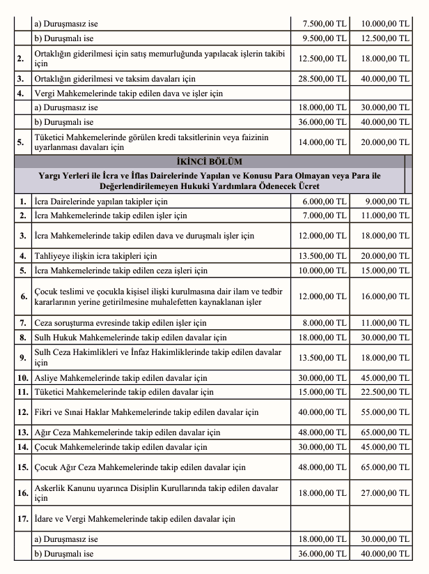 - İcra Mahkemeleri‘nde takip edilen dava ve duruşmalı işler için ücret 12.000 TL’den %50 artışla 18.000 TL olmuştur.