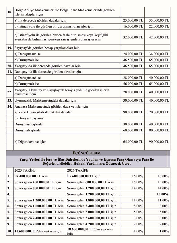 Resmi gazete‘de yayımlanan tarifede, konusu para olan veya para ile değerlendirilebilen hukuki yardımlara ilişkin nisbi ücret dilimlerinde önemli değişiklikler yapılmıştır. 2025 yılında 10 dilim olan tarife, 2026 yılında yeniden düzenlenmiş ve %13’lük yeni bir dilim eklenmiştir: