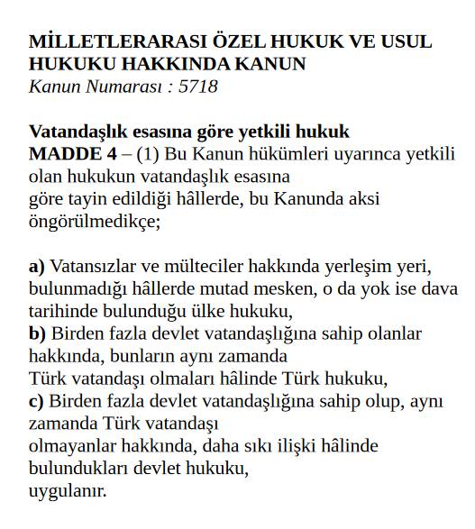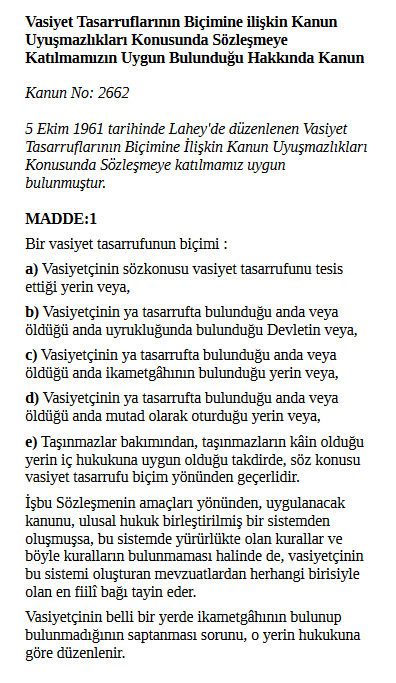 Öncelikle, 5718 sayılı Milletlerarası Özel Hukuk ve Usul Hukuku Hakkında Kanun (MÖHUK) madde 20/4‘e göre, ölüme bağlı tasarrufların şekli, bu Kanunun hukukî işlemlerin şekline ilişkin hükümlerine tâbidir. Bununla birlikte, ölenin millî hukukuna uygun şekilde yapılan ölüme bağlı tasarruflar da geçerli kabul edilir. Bu hüküm, vasiyetnamelerin şekli geçerliliği konusunda geniş bir esneklik sağlamaktadır.