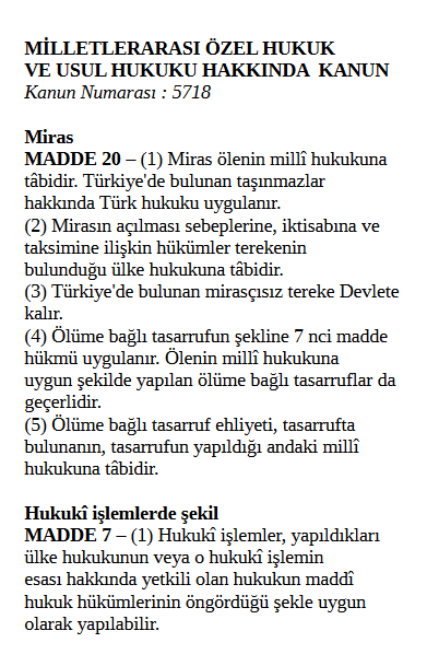 Bununla beraber, vasiyetnamenin esasına ilişkin konular, MÖHUK madde 20/1 uyarınca mirasbırakanın millî hukukuna tâbidir. Ancak, Türkiye’de bulunan taşınmazlar hakkında Türk hukuku uygulanır. Bu durumda, Almanya’da düzenlenen bir vasiyetname ile Türkiye’deki taşınmazlar hakkında tasarrufta bulunulmuşsa, bu tasarrufların geçerliliği Türk hukukuna göre değerlendirilecektir. Örneğin, Türk hukukunda kabul edilmeyen bir tasarruf şekli, şeklen geçerli olsa bile esasen geçersiz sayılabilir.