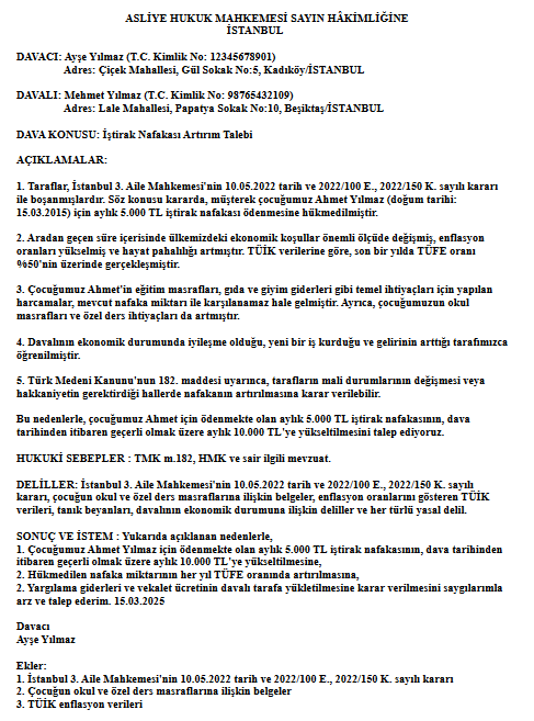 Um diese Klage einzureichen, muss zunächst eine Klageschrift vorbereitet und dem Gericht vorgelegt werden. In der Klageschrift sollte klar angegeben werden, dass basierend auf Artikel 176 des türkischen Zivilgesetzbuches (bei Kindesunterhalt auf Art. 183) eine Unterhaltserhöhung beantragt wird. Außerdem sollten die Gründe für die Erhöhung detailliert erläutert und der neue beantragte Unterhaltsbetrag eindeutig angegeben werden.